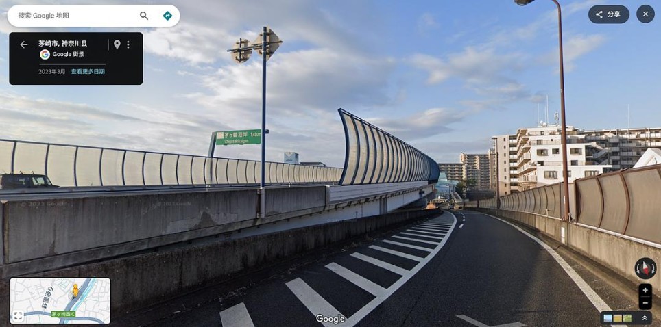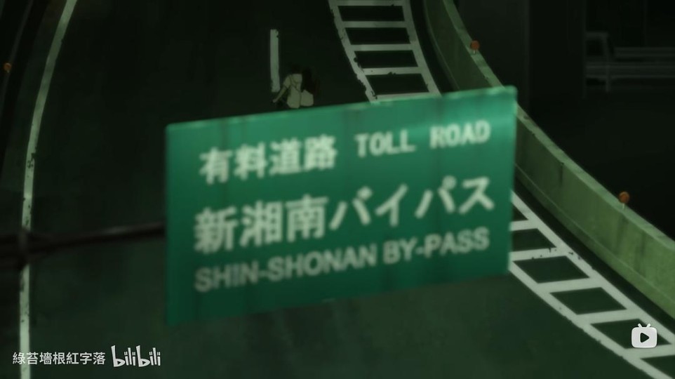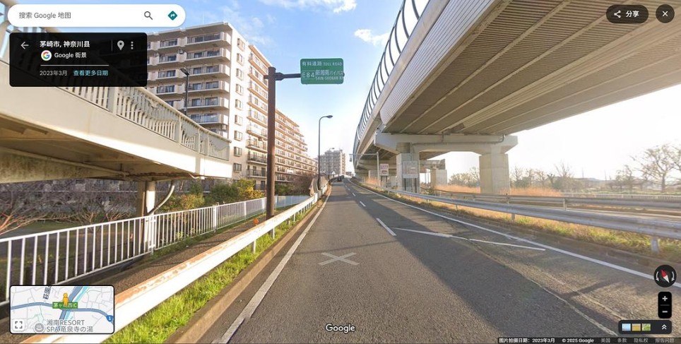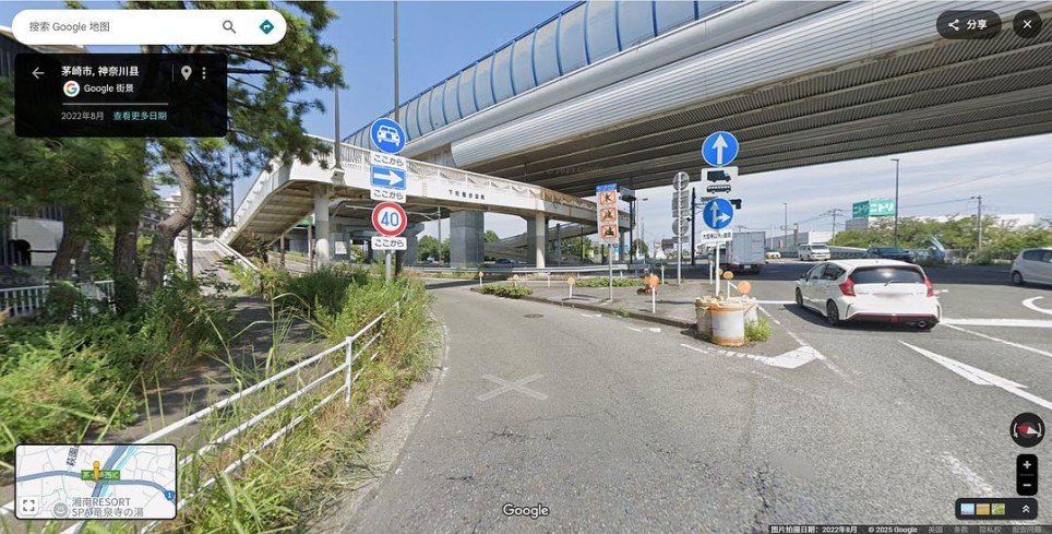 从上面几幅画面中可见,他们上了付费公路“Shin-Shonan By-Pass”,且上路之后前方还有1km抵达“茅崎中央”,反方向的路牌表明还有2km就是前往茅崎海岸的出口。根据这两个条件,倒是可以找到正确地址:在图中红色标出的这条“Shin-Shonan By-Pass”付费公路上,我用黄色短线标出了离两个关键地点距离正确的位置。