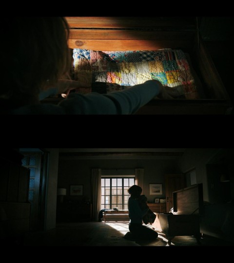 当Carol醒来看到Helen的躯体,她明白只能接受伴侣逝去的事实。于是她打开衣箱,拿出一张被子,这是一张百纳被(Quilt)。这是一种带方格编织图案的薄棉被,朝上那层通常是由不同布料拼接而成,色彩和图案会缤纷多样。完成一张百纳被需要搜集布碎和反复缝补,一般需要较长时间,它也变成了一种礼物和人生里程碑的纪念品。Carol和Helen手上都没有戒指,或许这是二人为结婚准备的纪念品,或是二人共同制作的劳动成果,又或者它是家族寄托祝福的礼物,无论如何它是Carol选择用来安葬伴侣的物品。Carol轻轻抱住被子,就像抱住了逝去的伴侣,这张被子承载着Carol对Helen含蓄的爱与思念。